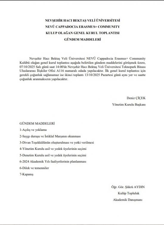 - "NEVÜ Avrasya Türk Öğrenci Kulübü" İlk Genel Kurul Toplantı Duyurusu