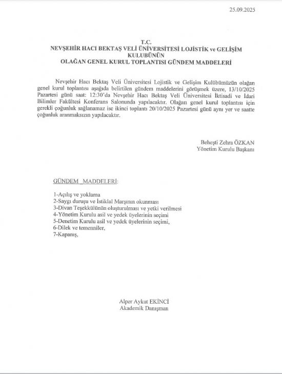 - "NEVÜ Lojistik ve Gelişim Kulübü" Olağan Genel Kurul Toplantı Duyurusu