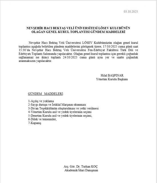 - "NEVÜ LÖSEV Kulübü" Olağan Genel Kurul Toplantı Duyurusu