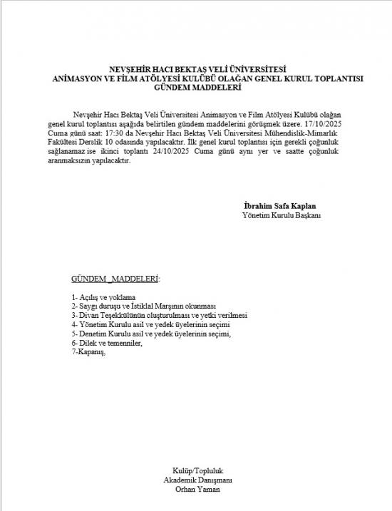 "NEVÜ Animasyon ve Film Atölyesi Kulübü" Olağan Genel Kurul Toplantı Duyurusu