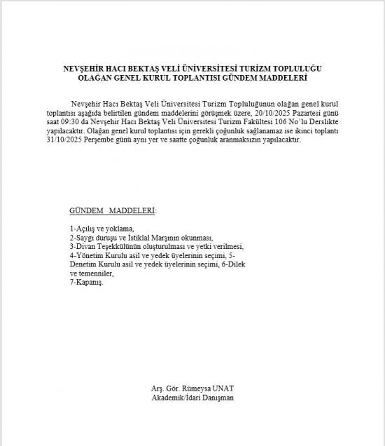 "NEVÜ Turizm Topluluğu" Olağan Genel Kurul Toplantı Duyurusu