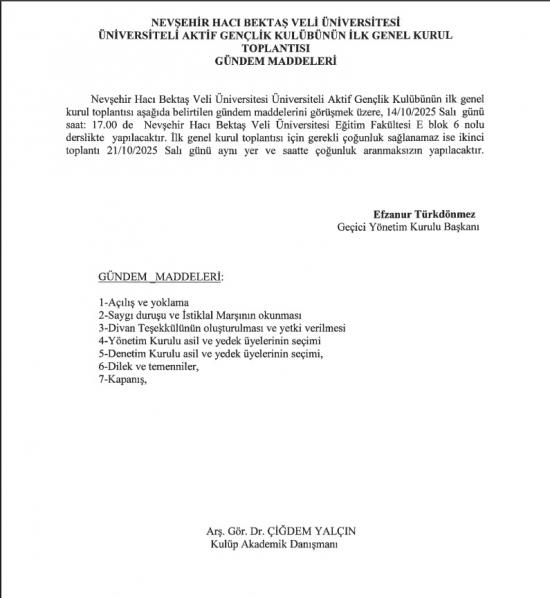"NEVÜ Üniversiteli Aktif Gençlik Kulübü" Olağan Genel Kurul Toplantı Duyurusu