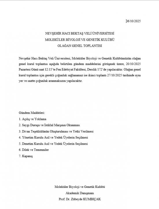 "NEVÜ Moleküler Biyoloji ve Genetik Kulübü" Olağan Genel Kurul Toplantı Duyurusu