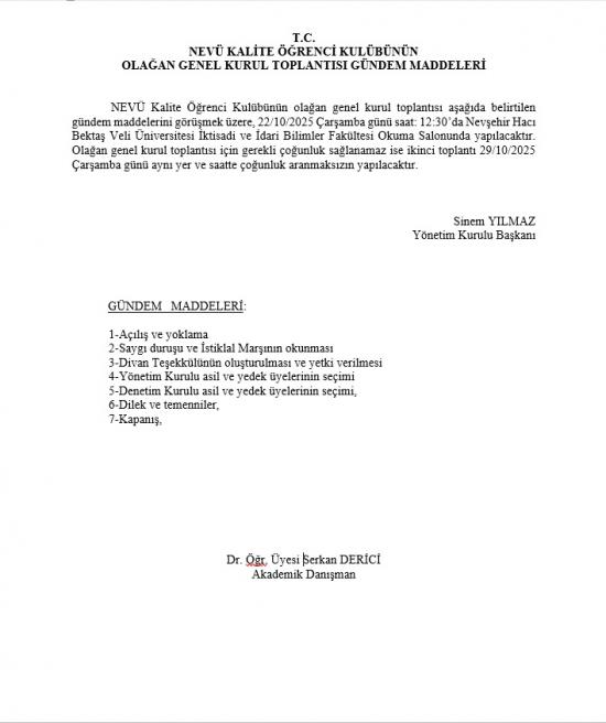 - "NEVÜ Kalite Öğrenci Kulübü" Olağan Genel Kurul Toplantı Duyurusu
