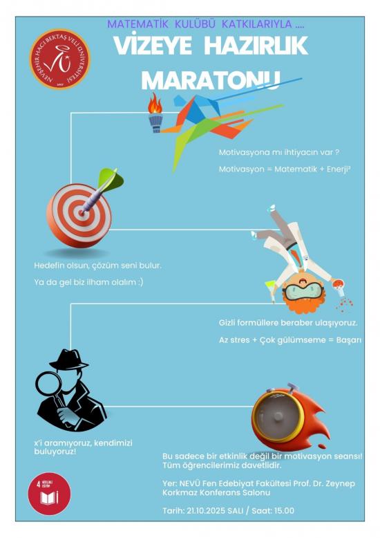 Nevşehir Hacı Bektaş Veli Üniversitesi Matematik Kulübü tarafından, öğrencilerimizin vize sınavları öncesinde motivasyonlarını artırmak amacıyla “Vizeye Hazırlık Maratonu” adlı etkinlik düzenlenecektir. Etkinlik kapsamında, sınavlara hazırlık sürecinde çalışma sistemlerini geliştirmeye yönelik matematiksel yaklaşımlar paylaşılacak ve motivasyonu artırıcı kısa filmler gösterilecektir.