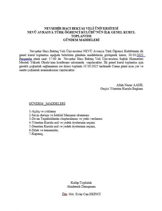 - "NEVÜ Avrasya Türk Öğrenci Kulübü" İlk Genel Kurul Toplantı Duyurusu