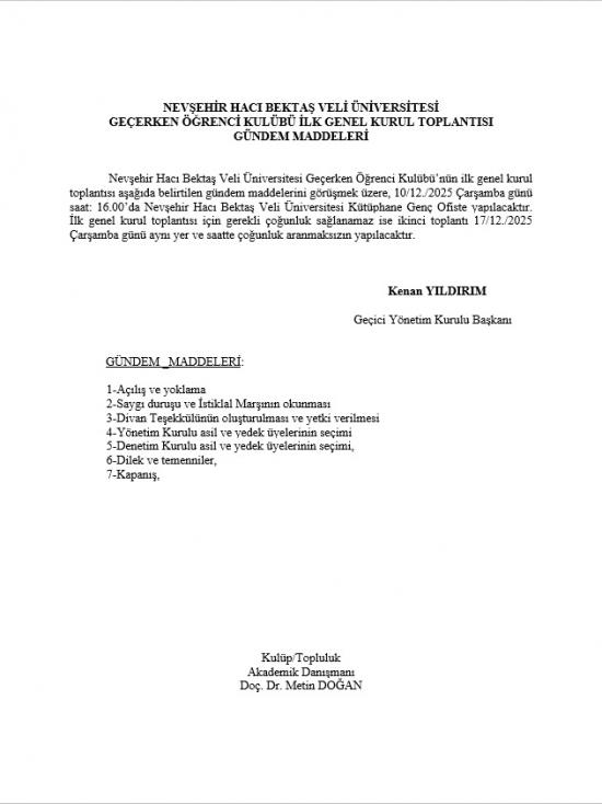 - "NEVÜ Geçerken Öğrenci Kulübü" İlk Genel Kurul Toplantı Duyurusu