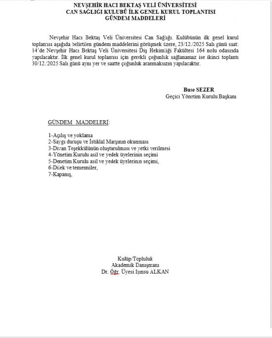 - "NEVÜ Can Sağlığı Kulübü" İlk Genel Kurul Toplantı Duyurusu