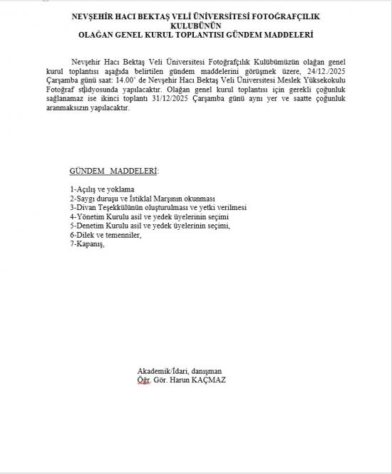 - "NEVÜ Fotoğrafçılık Kulübü" Olağan Genel Kurul Toplantı Duyurusu