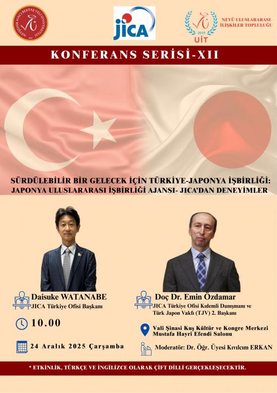 NEVÜ Uluslararası İlişkiler Topluluğu (UİT) tarafından, Konferans Serisi-XII kapsamında düzenlenen "Sürdürülebilir Bir Gelecek İçin Türkiye-Japonya İşbirliği: Japonya Uluslararası İşbirliği Ajansı (JICA) Deneyimler" başlıklı etkinlik 24 Aralık 2025 Çarşamba günü saat 10.00’da Vali Şinasi Kuş Kültür ve Kongre Merkezi, Mustafa Hayri Efendi Salonunda gerçekleştirilecektir.
