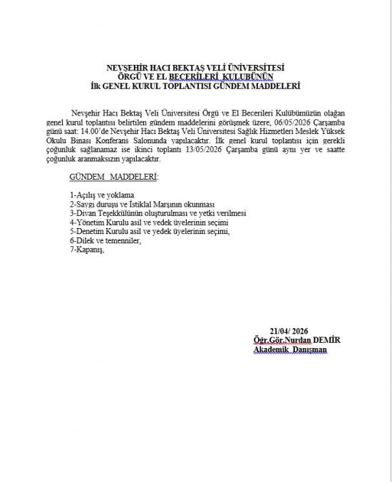 "NEVÜ Örgü ve El Becerileri Kulübü" Olağan Genel Kurul Toplantı Duyurusu